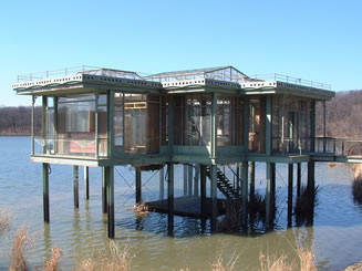 Crowley was hired for “The Lake House” in 2004, Smart notes on the TMH website at http://www.trianglemodernisthouses.com/lakehouse.htm. He wanted to build on a lake with nothing on it — no piers, no houses – but few of those locations exist. Through negotiations with a nature preserve, he took the project from sketches to completion in just 10 weeks with a construction crew of nearly 100 people. As part of the agreement to with the nature preserve, the house was destroyed afterwards.