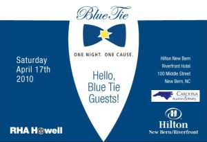 April 9, 2010 (NEW BERN, NC) — “Blue Tie: One Night, One Cause,” an evening of live dance music, food, cocktails, and an auction to be held April 17 at the Hilton Riverfront Hotel in New Bern, continues to acquire new sponsors and in-kind donations from companies and clubs to benefit children and adults with disabilities.