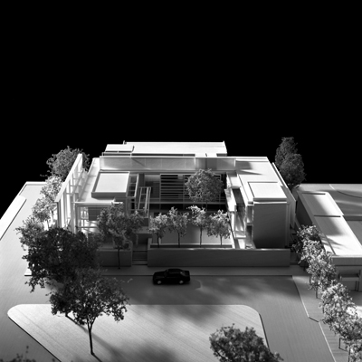 The site is flat, extremely sandy, and in an exclusive neighborhood of gridded plats where most villas are built in the center of property. Ignoring that precedent, Villa Al Bahar is comprised of a central glass, steel, and concrete mass with glass wings that wrap around and overlook a central courtyard. “Public” spaces are on the ground level. The family’s private living spaces are on the second level. Women servants will live on the third level and the men servants’ will occupy generous quarters below grade near a huge garage and workshop.