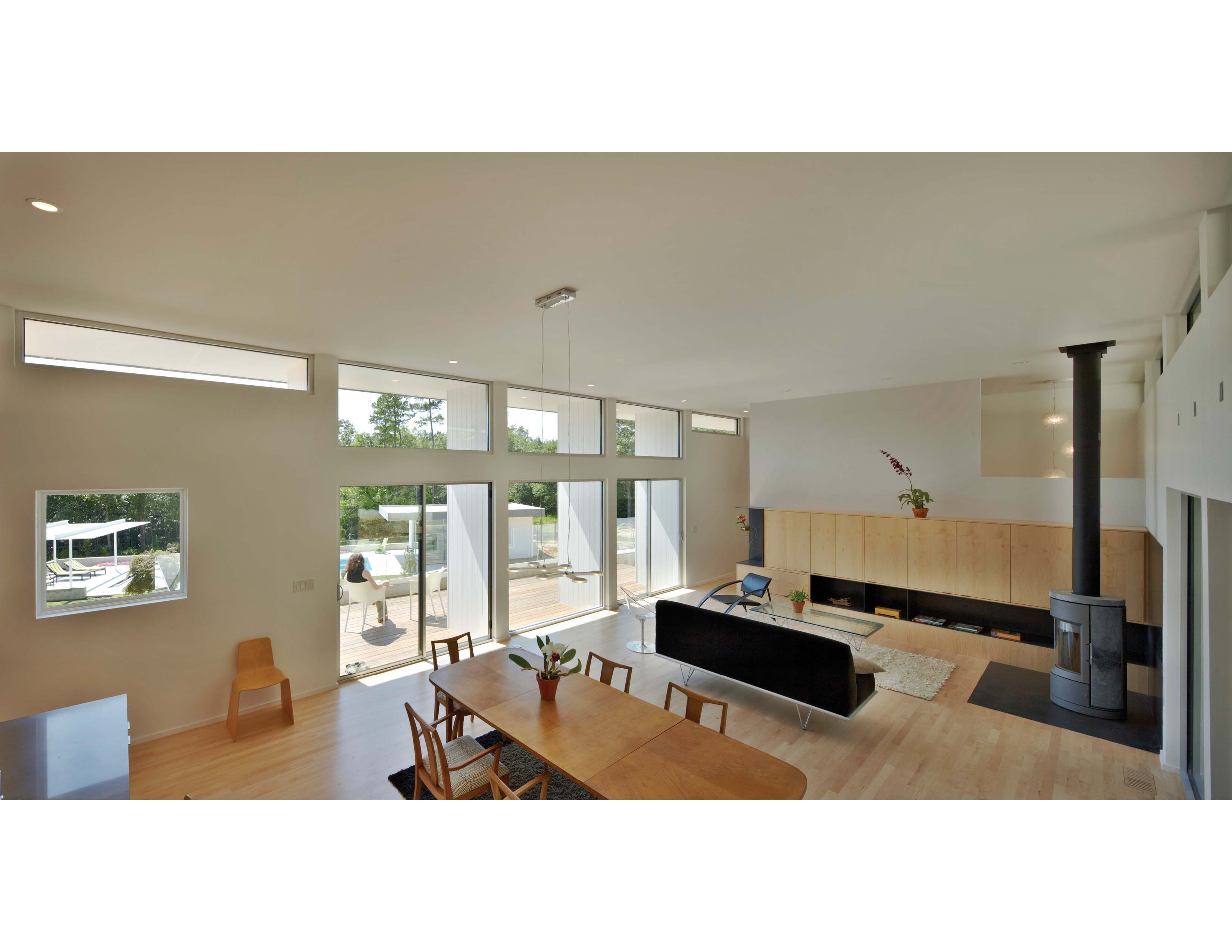 “After living in a two-story, 1914 farmhouse for 30 years, which originally had no insulation, no running water, no electricity, and only the six fireplaces for heat, I was well aware of the limitations of this vernacular housing,” said homeowner John Monroe. “Having a comfortable living environment with reduced consumptive energy usage was appealing. I’ve spent the summer in the new house and beside the absolute beauty of the modern design, knowing that the house remains cool even with its almost full wall of windows makes me feel that the extra efforts to insulate the house and use the geo-thermal system, among other efforts were well worth it.”
